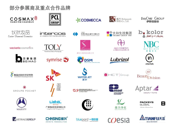 供应线部分品牌展商:莹特丽,上海宜侬,科丝美诗,东晟源,百岳特,科玛,上海仙萃生物,诺斯贝尔,天津市双马香精香料,上海香料研究所,广东铭康香精香料,广州芬豪香精有限公司,山东焦点福瑞达生物,奇华顿日用香精香料,贝豪,臻臣,丽鑫生技,伊斯佳,巴斯夫,帝斯曼,德之馨,路博润,亚什兰,中山中研、嘉吉,舒柏雅,合众,Albéa,HCT......