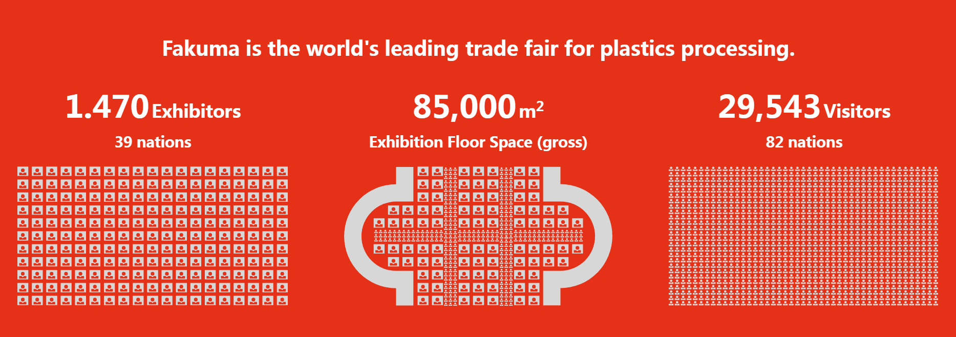 2021年Fakuma展会,来自德国、意大利、法国、美国、西班牙、巴西、中国、新加坡等38个国家的1900家参展商前来参加,展会面积总达到85000平方米,吸引了全球120个国家的5万名专业观众参观并洽谈业务。