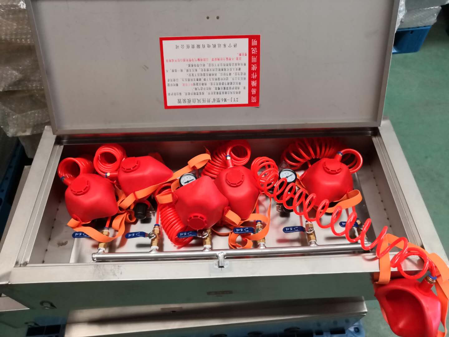 ZYJ-M6压风自救装置组成结构:ZYJ-M6压风自救装置是一种新型的隔绝式气体呼吸防护装置,本装置一箱六组(可根据要求设计组别),能同时提供六人使用,达到互相照顾的效果。ZYJ-M6压风自救装置由箱体、安装板、进气管、门锁、呼吸器(多组)等组成。箱体、安装板、进气管采用不锈钢制造而成。呼吸器安装于箱体内,呼吸器由调节阀、减压过滤阀、弹簧软管、自吸过滤式口罩等组成。减压过滤阀过滤空气中的杂质、水和油质、降低压风噪音,能精确调整控制供气压力,使工人呼吸无阻碍、畅通舒适。ZYJ-M6压风自救装置工作原理:ZYJ-M6井压风自救装置采用自吸过滤式口罩直接带在嘴上进行呼吸,且通过弹簧软管连接,不影响使用人员视线,弹簧软管可自由伸缩,使用人员能在弹簧软管可伸缩范围内自由活动。ZYJ-M6压风自救装置供气一般采用矿井压风管路。
