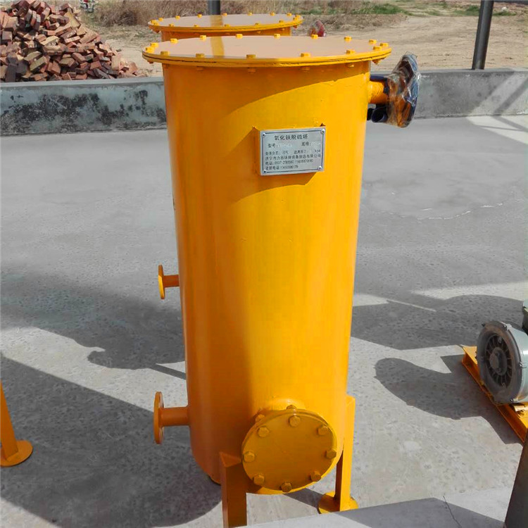 干法脱硫是在圆柱状脱硫塔内装填一定高度的脱硫剂,沼气自下而上通过脱硫剂,H2S被去除,实现脱硫过程,水处理厂常用的脱硫剂为氧化铁,其粒状为圆柱状,氧化铁脱硫的原理如下: