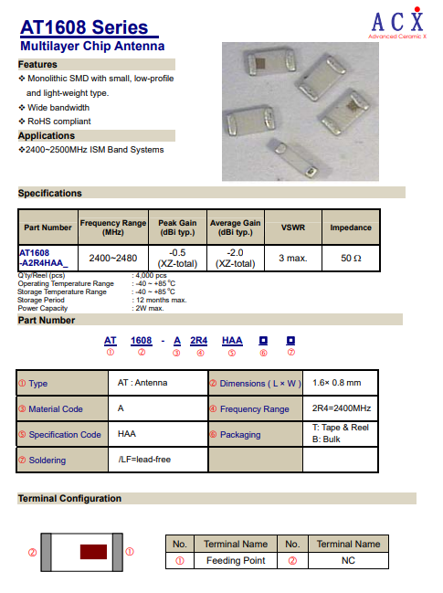 AT1608-A2R4HAA 贴片天线 ACX