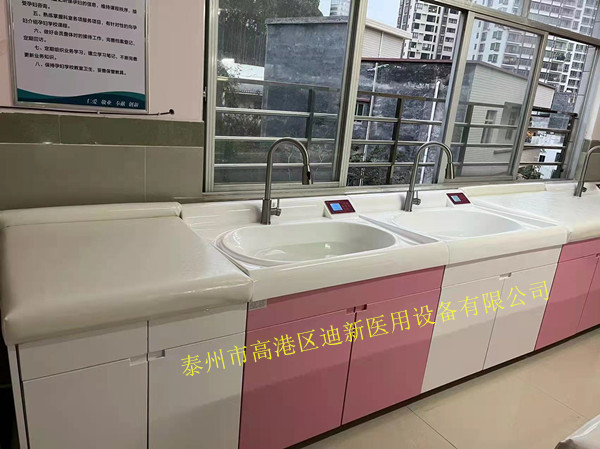 迪新婴儿洗浴中心拥有良好的台面质感,细腻亲切,无冰冷感,全弧形造型设计给婴儿体贴的呵护与关怀,洗礼池和游泳池特有的裙边设计,既方便固定一次性防交叉感染隔膜袋,又防止台面上污水流入池内。游泳池利用有效的水平面积提供更加理想的池内净深度,满足婴幼儿洗浴时的安全高度需要,同时有效保持水温特别设置水位线,防止婴儿游泳时池水外溢。
