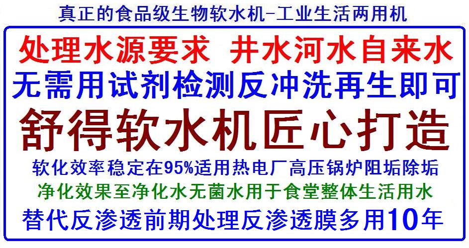 水处理设备食品级生物软水机适用于供暖锅炉热电厂高压锅炉配置 ,供暖锅炉热电厂等企业特别是使用井水或河水的企业、舒得净水软水是贵企业的理想的选择、食品级生物软水机的优势3-6个月反冲洗一下就达到再生的功能、操作无费用使用寿命10-20年、可配置反渗透前期软化装置让反渗透膜至少10年甚至和超滤膜一样20年,因为水垢真的是被彻底解决了所以反渗透膜微孔堵不起来,更可观的是净化水无菌水软化水直接供应企业食堂用水提高干职员工的生活水准、车间员工的开水炉供水、直接代替桶装水。而树脂软水机需要每次锅炉供水前用试剂检测树脂酸含量是否失效、酸含量一旦失效就表示树脂已经没有软化功能、必须使用专业盐石生化才能继续使用、树脂的使用寿命不高于3年就必须更换使用时间过长软化效果直线下降甚至直接无效、锅炉就更危险了,说句现实的话一台舒得牌净水器软水机连井水河水都可以处理到净化水无菌水软化水、而且可以使用10-20年、去垢效率稳定高达95% 以上、而树脂软水机在树脂饱满期间去垢效率不会高于45% 而且极不稳定、因为阳离子树脂是靠酸养着的随时有失效的可能、所以才要求在锅炉供水前需要用试剂检测通过后才能供水,比较一下就知道了产品的长处和短处、毕竟技术在不断的提高科学在不断的进步,如果仍然继续在原地踏步有多损失大家都是聪明人。