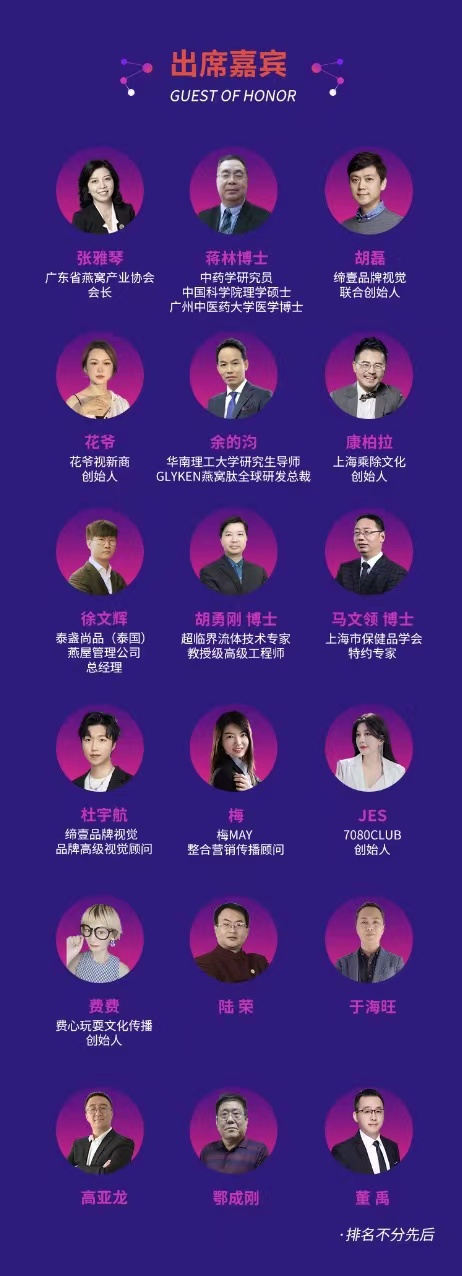 为更好的服务客户,拓展业务,本次大会将设立企业宣传展示位,“上海燕博会参展商”免费参加,每家只限一个,展示位有限先报先安排,报满为止。同时邀请了行业权威专家、上下游行业大咖参会、参观,共同探索燕窝滋补品领域新流量转型出路、共襄产业高质量发展大计,为滋补同仁提供交流和经验分享的绝佳机会,我们期待您的莅临!