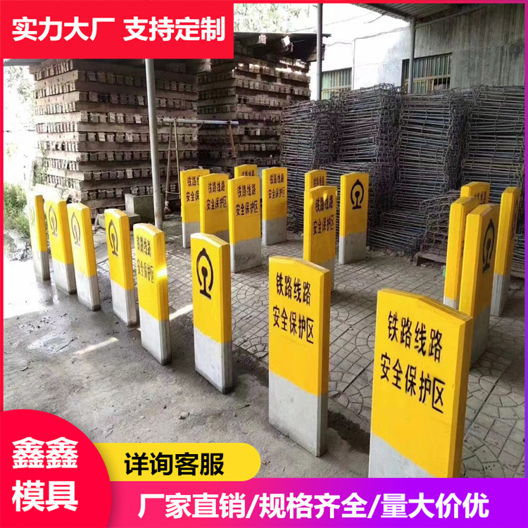 保定鑫鑫建材模具厂铁路AB桩模具有严格的尺寸要求 铁路A桩模具尺寸:90*45*10cm,铁路A桩模具正面刻着“铁路线路安全保护区”,背面刻着“铁路徽,地埋400mm”。其中A型标桩采用钢筋混凝土板制作而成,直接埋入土层中,沿着铁路保护区边界大概200m左右埋设一个,特殊地点可酌情增加或减少。B桩是采用钢筋混凝土立柱及标牌制作埋设于混凝土基础中,B桩为辅助型,主要适用于人员活动频繁地段,桥隧两段等醒目地点。