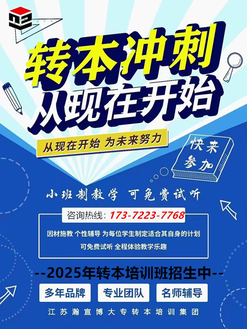 江苏瀚宣博大五年制专转本培训学校,专业从事五年制专转本辅导已有十七年,汇集了众多转本经验丰富的授课老师,辅导英语和各主考院校所有专业课,1-5年级备考生均可报名参加,一次报名可循环上课至考前,越早报名,课时量越多,基础越扎实。从基础测试、学习规划、课程安排、学习·进度、查漏补缺、刷题等等一步步来推进。还有专业的老师进行指导,教给考生更多的学习方式,针对考生的个人不同基础情况指导专业的复习方式,提供更加详细精准的复习资料,紧扣大纲,涵盖考点、强化考试题型、提高解题速度、强化解题思维;开设班次有:周末班、单科班、寒暑期集训班、考前冲刺班等多个班次可选择,更多江苏五年制专转本详情请联系173微7223同7768严老师,预约试听课程并领取招生简章一份。