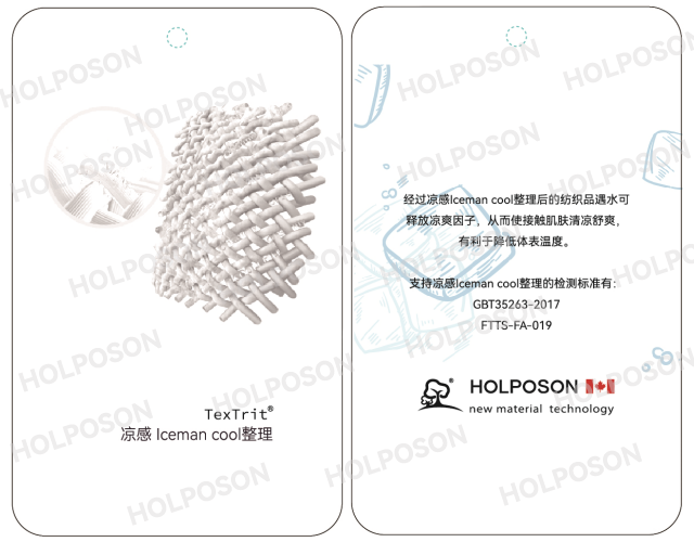 HOLPOSON® Iceman COOL-PLUS 是本公司以超细云母粉为主,并运用萃取技术,经科学精心开发研制的纺织品用后整理剂。它能提高织物的热导系数,迅速吸收人体表面汗液,同时将热量导出散发到空气中,从而带给人体凉爽的感觉。本产品还具有一定的防紫外线效果。主要适用于内衣面料、衬衫面料、床上用品面料、登山服、高尔夫服装、休闲系列服装面料、各种服饰面料、家用纺织品面料等。