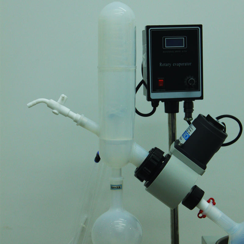产品结构:蒸馏瓶可以是具有标准地面接口的梨形或圆底烧瓶,其通过高回流蛇形冷凝管连接到减压泵,并且回流冷凝管的另一个开口通过地面接口连接到接收烧瓶以接收蒸发的有机溶剂。冷凝水管和减压泵之间有一个三通活塞。当系统连接至大气时,可移除蒸馏瓶和液体接收瓶以转移溶剂。当系统连接到减压泵时,系统应处于减压状态。使用时,先将烧瓶减压,然后启动电机旋转烧瓶。操作结束时,应先停机,再通大气,以防止烧瓶在旋转过程中脱落。作为蒸馏的热源,常配有相应的恒温水槽。