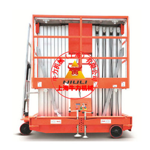 上海牛力机械铝合金升降机整机重量轻,机动性好,结构紧凑,可进入一般电梯以及狭小通道,特制的桅柱间导轨装置,使升降平稳自如。广泛适用于工厂、市政管理、树木检修、等用于载人高空作业设备。双桅柱铝合金式升降机,推行轻便,有装卸系统单人可上卸车支腿采用插接式,能跨越障碍,离地平衡保证安全作业。采用经特殊设计的高强度铝合金桅柱精制而成,具有电子支腿插实调平指示系统,有推行倾倒装置及上卸车装置,使产品在推行时更能方便穿越2米以下门厅。升降由电子电路控制,更可靠。