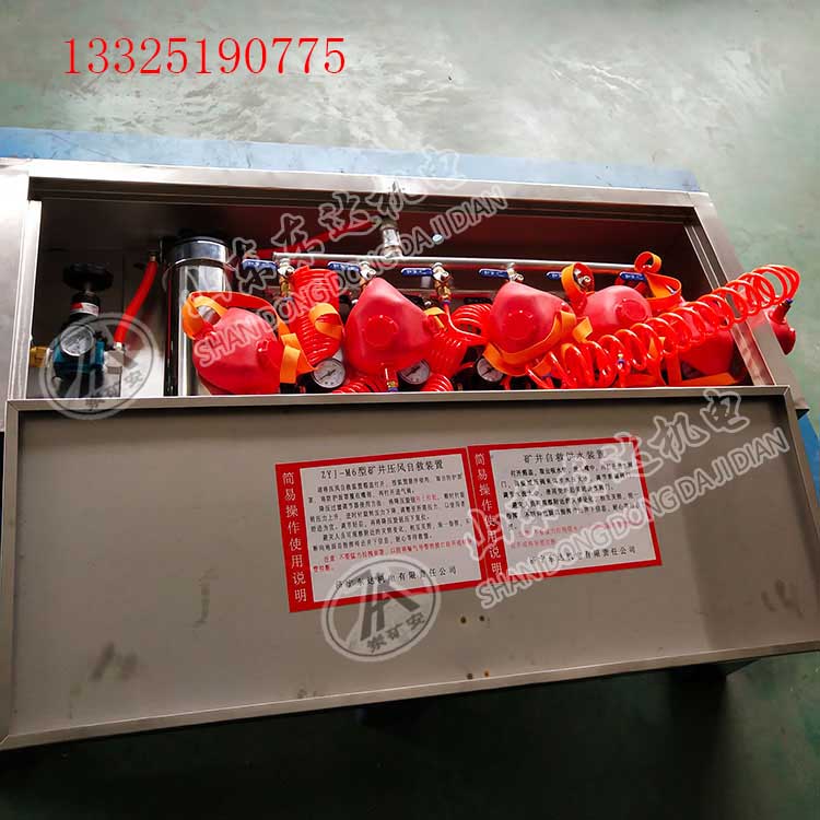 ZYJ-M6压风自救装置组成结构:ZYJ-M6压风自救装置是一种***的隔绝式气体呼吸防护装置,本装置一箱六组(可根据要求设计组别),能同时提供六人使用,达到互相照顾的效果。ZYJ-M6压风自救装置由箱体、安装板、进气管、门锁、呼吸器(多组)等组成。箱体、安装板、进气管采用不锈钢制造而成。呼吸器安装于箱体内,呼吸器由调节阀、减压过滤阀、弹簧软管、自吸过滤式口罩等组成。减压过滤阀过滤空气中的杂质、水和油质、降低压风噪音,能调整控制供气压力,使工人呼吸无阻碍、畅通舒适。ZYJ-M6压风自救装置工作原理:ZYJ-M6井压风自救装置采用自吸过滤式口罩钟带在嘴上进行呼吸,且通过弹簧软管连接,不影响使用人员视线,弹簧软管可伸缩,使用人员能在弹簧软管可伸缩范围内活动。ZYJ-M6压风自救装置供气一般采用矿井压风管路。