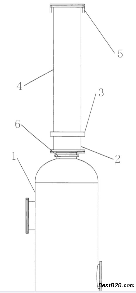 底端通过法兰连接固定在一起并将泄爆片压紧,标准变径管的顶端通过法兰与波纹管软连接的底端连接固定,波纹管软连接的顶端通过法兰与导爆管的底端连接固定,导爆管的顶端穿过房顶平台并伸出房顶平台外;所述钢结构支架为由多根钢柱搭建而成的空间结构,泄爆桶位于钢结构支架内, 钢平台位于钢结构支架顶部由钢结构支架支撑,且钢平台位于、