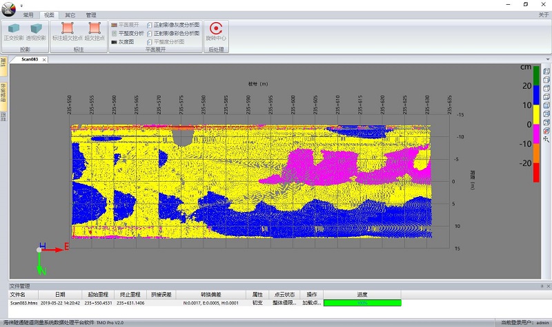 TMO Pro 隧通扫描仪点云数据处理分析软件是由从事隧道测量的工程和专业软件开发经验、技术的基础上开发完成的。用于隧道测量过程中超欠挖分析、三维点云平面展开分析、任意里程断面分析、初支与衬砌厚度分析、方量统计分析、净空分析、道路分析的专业隧道测量系统软件。兼容多种数据来源,包括三维激光扫描仪、全站仪等。与隧通TMF全站仪数据采集终端、隧通TMO全站仪测量数据处理分析软件、隧通TM-OnSite隧道三维激光扫描软件现场版、隧通TMO Viewer隧道质量与安全监控云平台构成了隧通隧道测量系统。