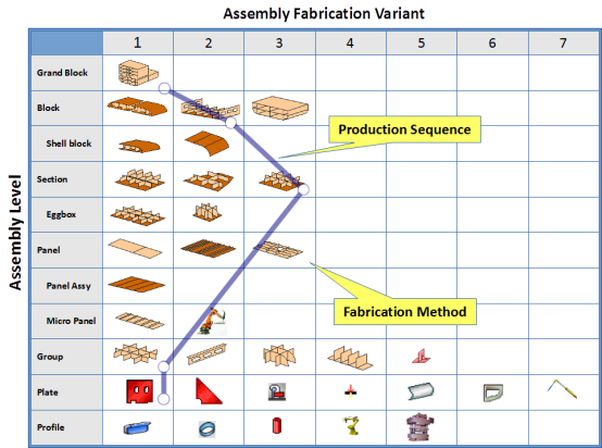 利用装配生产应用程序(可选)可以根据部件/装配属性和生产能力自动生成任务分解结构(WBS):假如船厂没有现成的生产准备任务信息,系统可自动执行任务来确定所有零部件的生产装配流程。