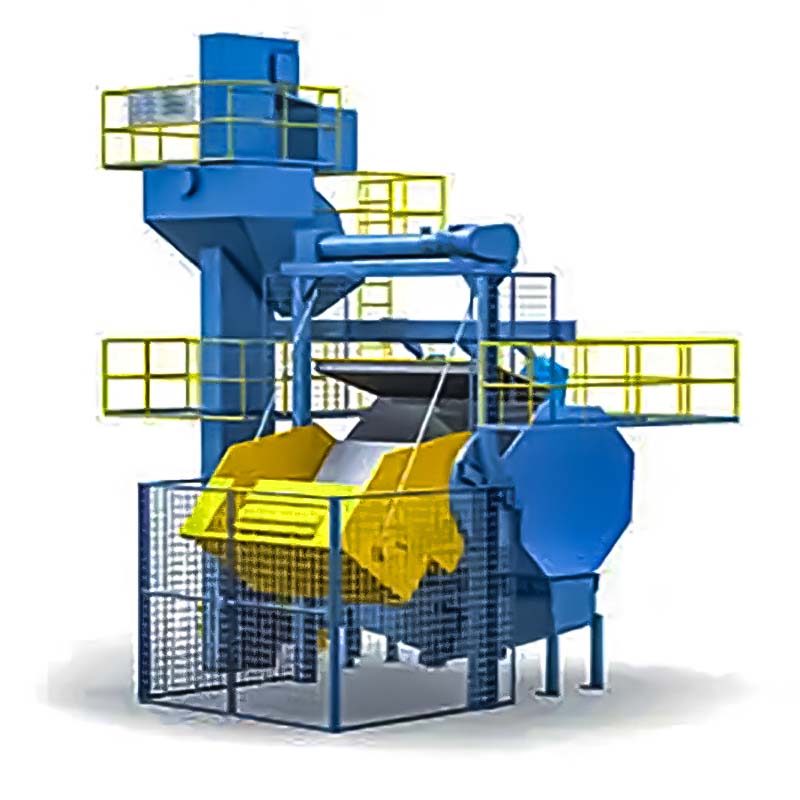 履带式抛丸机的铸件运载装置,是由一对圆形端盘(或带支撑环)和一条履带组成,形似上部开口的滚筒。工作时,履带转动,使带上的铸件不断翻动,并接受上方抛丸器的抛射。履带式抛丸清理强化机是根据用户要求设计的一种新型专用抛丸清理设备,用于铸件及锻件、小型圆弹簧、轴承等工件的清理强化。本设备抛丸量大,密封性好,清理效果、生产效率及除尘效果有较大的提高,使用轧制Mn13室体护板,维护费用减少了约60%。通过抛丸清理强化,不但可以去除工件表面的锈蚀、氧化皮、铸造后的型砂等,还可以降低工件的内应力,提高工件的抗疲劳强度。本机可单机使用也可配线使用,具有较高的清理效率。工作过程为连锁启动一上料一进人抛丸室一关门一抛丸器起动一工件翻滚一丸料门开-抛打滚翻工件一丸料门关一门开一工件退出抛丸室一由输送机输送一上卸料可同时进行丸料循环。它的工作原理如下:在清理仓内加入规定数量的工件后,大门关闭,机器起动,工件被滚简带动,开始翻转,同时抛丸器高速抛出的弹丸形成扇形束,均匀地打击在工件表面上从而达到清理的目的,抛出的弹丸及砂粒从履带上的小孔,流入底部的螺旋输送器上,经螺旋输送器送入提升机内,由提升机提到分离器中进行分离。含尘气体由风机吸送到除尘器中过滤后,变为清洁空气,排人大气中,灰尘经空气反吹落入除尘器底部的集尘箱中,用户可定期清除。废砂由废料管流出,用户可回用。丸砂混合物由回用管回收进入室体,待分离器分离后再回用。抛丸器的布置经过计算机三维动态模拟,所有布置的角度、位置均由计算机设计确定。在照顾所有需清理工件的基础上,尽量减少弹丸的空抛,从而提高了弹丸的利用率,减少了对清理室内防护板的磨损。抛丸清理室的室体系焊接结构,由室壳、室顶及室内防护等部分组成。室壳底部有螺旋输送器,内部装有履带及其传动机构,端部装有端盘,内部采用耐磨护板防护,室顶固定抛丸器。安全抛丸器设计了简单可靠的安全防护装置,当设备进行检修、润滑等操作时,该装置可保证进人清理室人员的安全。