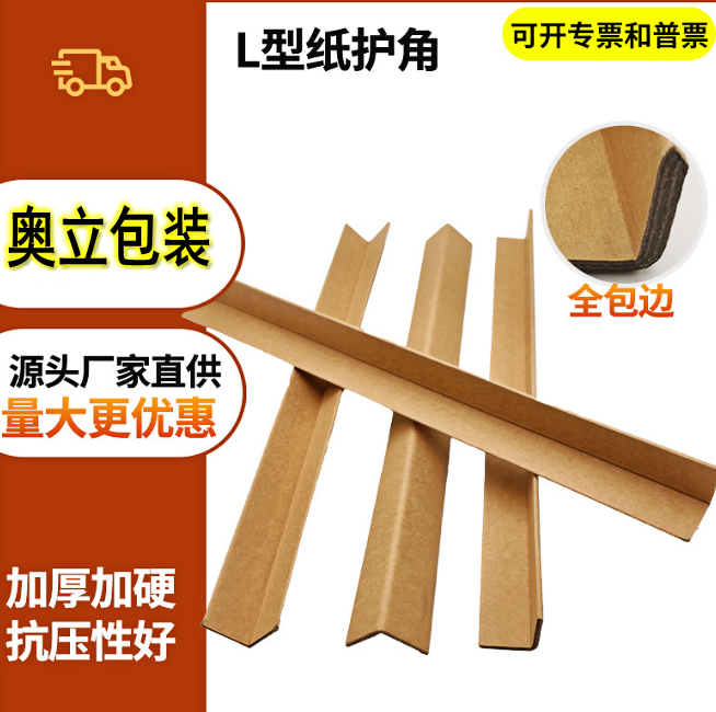 纸护角又称边缘板或护角纸板,是一种由多层牛皮纸经过粘合和压制而成的包装材料。它通常具有L形和U形两种主要形状,两端面光滑平整、无明显的毛刺,且相互垂直。纸护角的主要成分包括纱管纸和牛卡纸,可以通过成套护角机定型压制而成。
