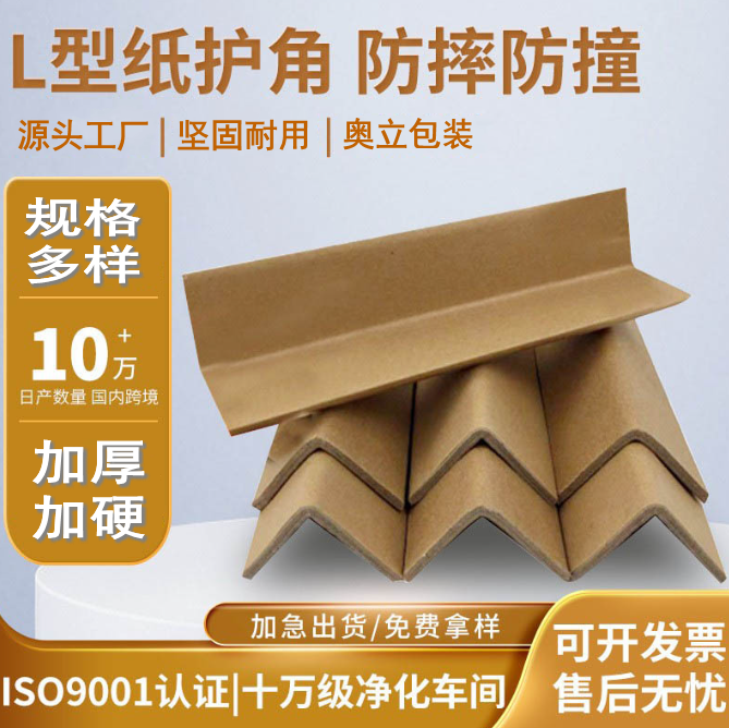 纸护角又称边缘板或护角纸板,是一种由多层牛皮纸经过粘合和压制而成的包装材料。它通常具有L形和U形两种主要形状,两端面光滑平整、无明显的毛刺,且相互垂直。纸护角的主要成分包括纱管纸和牛卡纸,可以通过成套护角机定型压制而成。