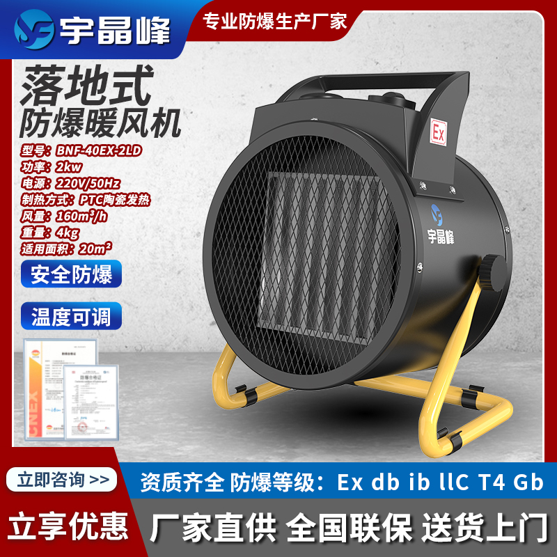 宇晶峰防爆暖风机适用于容易发生爆燃的地方,如冷库,空调房、化工车间、精细车间、喷漆、火药、烟花、石油、冶金、医药、纺织、食品、生物工程、制药、仓库、航天航空工程及军工等爆炸性环境的场所。
