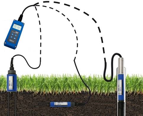 测量原理:基于TDR时域反射技术。用以直接测量土壤或其他介质的介电常数,介电常数又与土壤水分含量的多少有密切关系,土壤含水量即可通过模拟电压输出被读数系统计算并显示出来。测量时,金属波导体被用来传输TDR信号,工作时产生一个1GHz的高频电磁波,电磁波沿着波导体传输,并在探头周围产生一个电磁场。信号传输到波导体的末端后又反射回发射源。传输时间在10ps-2ns间。厂家发明了这种测量技术,使得仪器可以检测到小至3ps的时间信号。建立了时间采样的方法。从而使得土壤水分的测量变得更为准确和方便。