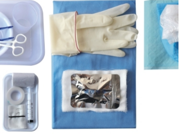 结构及组成:本产品由基本组件一次性使用口罩、帽、一次性使用孔巾和选用组件一次性使用灭菌橡胶外科手套、医用脱脂纱布块、一次性医用中单、一次性使用手术衣、一次性医用垫、医用缝合针、非吸收性外科缝线、消毒液刷、医用保护套、塑料盆、方盘、小碗、弯盘、手术刀片、医用棉球、医用棉纱垫、药杯、固定夹、口杯、纱布绷带、医用碘伏棉球、透气胶带、一次性使用医用橡胶检查手套、一次性使用配药 用注射器、止血钳、一次性使用敷料镊、包布、医用剪组成;