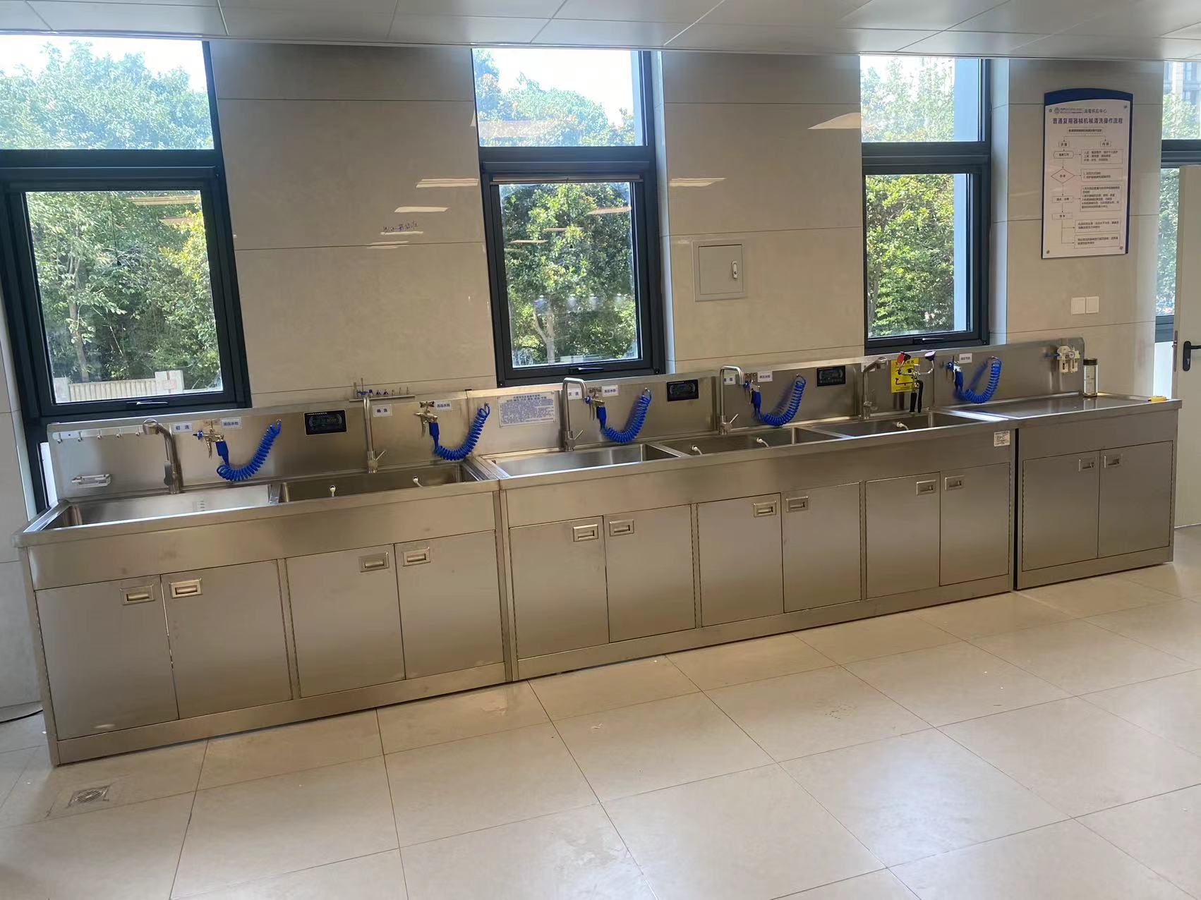 安装完好配备上、下水管和接水龙头,客户只需5—10分钟即可全部安装完毕、投入使用。为方便医务人员的清洗工作,内窥镜清洗槽下部特设有储存柜,可存放试剂、手套等医疗器械。