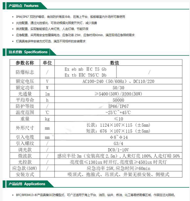 BFC8413防爆泛光灯本产品具备IIC防爆型式,可广泛适用于海上平台、油田、钻井、炼油、化工等易燃易爆区域,作固定泛光照明。