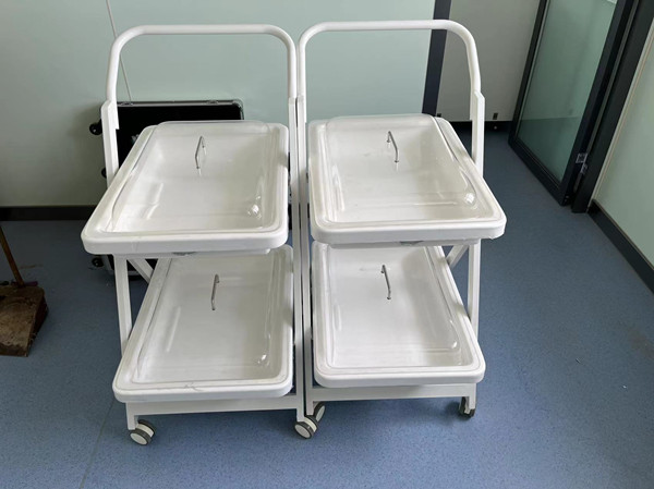 内镜转运车其周转箱材料亦由制造清洗槽台面的高分子复合材料独立开模制成,车体由不锈钢喷塑而成,具有耐腐蚀、不沾水、车行顺畅、取放方便等优点。盆内内镜存放导航隔条使污染部位和非污染部位分离。多层设计使客户在使用过程中可将清洁和污染的内镜分层标明后置放,避免交叉感染等功能