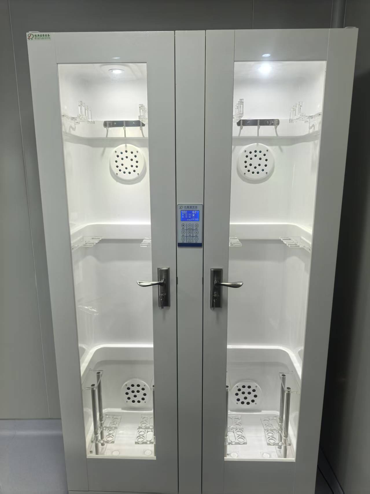 微电脑数显储存柜产品介绍A:数显储存柜分为单门储存柜DX-SX-I和双门储存柜DX-SX-II,硬镜储存柜DX-SXY-I;(型号命名的含义DX为迪新品牌,SX为数显简称,I为单门,II为双门,Y为硬镜简称)B:软镜储存柜规格参数:单门储存柜规格为630*535*2080mm(长*宽*高);双门储存柜规格为1150*535*2080mm(长*宽*高),外部采用多工艺处理的钢塑材料,内胆采用优质高分子材料,独立的开模整体吸塑成型,无缝隙,不藏污垢;易清洗、表面细菌残留低,使用方便、安全、快捷,对内镜无磨损。外壳与内胆融为一体,柜内空间密闭效果优异,外观简洁实用,美观大方。软镜柜内部设有上中下三层内镜悬挂系统,全方位的定位内镜,防止相互碰撞。内设智能化自动控制紫外线,循环风的消毒程序,消毒工作自动累时,另有照明、通风、循环干燥、温度湿度显示等功能。单门可储存4-6条内镜,双门可储存6-12条内镜。C:硬镜储存柜规格参数:规格为:630*535*2080mm(长*宽*高)外部采用多工艺处理的钢塑材料,与软镜的不同是硬镜柜没有高分子内胆。
