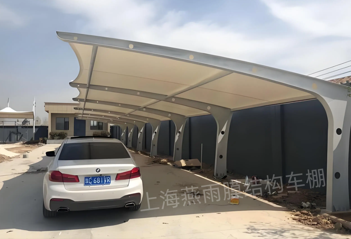 膜结构停车棚的耐久性,核心在于“张力平衡+高分子涂层”双重机制 。它不是靠厚度硬扛,而是用高强度PVDF或PTFE膜材,在钢构骨架上施加精准预应力,让整张膜像绷紧的鼓面一样均匀承力 。这种结构天然排斥积水、积雪,风一吹就滑落,避免长期负重变形 ⚡。加上表面氟碳涂层能反射90%以上紫外线,抗老化能力远超普通彩钢板或阳光板 。实测数据显示,在华东潮湿多雨+夏季暴晒环境下,优质膜材10年透光率衰减<8%,色牢度仍保持原色95%以上 ☀️