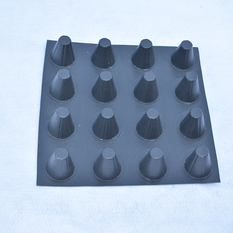 2、蓄排水板凸点侧壁较厚,故抗拉强度较大,能达到40T以上,远远大于塑料凸片(高密度聚乙烯排水板、高抗冲聚苯乙烯排水板)、塑料排水网垫等同类产品(可以实际碾压实验),可以满足回填土时的施工要求和正常运行要求;排水板,