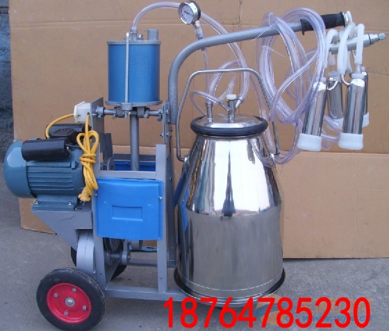 挤奶机由奶桶、奶杯组、调节器、集奶器、相关管路、真空表、活塞泵、传动装置、电机、食用橡胶管等组成。移动式挤奶机适用于小型养牛户和养牛场的挤奶机,是根据国家标准技术要求设计的,具有性能可靠,有效储备大,噪声低,操作简单等优点。挤奶机在水平状态下工作,出厂时一般已调好,它可以推到奶牛旁进行挤奶,也可作真空气源连接为管道式挤奶。本机结构紧凑合理。奶桶采用不锈钢制成,装有橡皮密封圈,工作时形成密封的容器。挤奶杯组装有集乳器。 YDH系列挤奶机分为单桶式和双桶式,单桶式一次挤一头牛,双桶式可同时挤两头牛。每头牛的挤奶时间为5-6分钟(正常奶牛)。单桶式适合15头以下的产奶牛群使用,双桶式适合于20-30头产奶牛群。