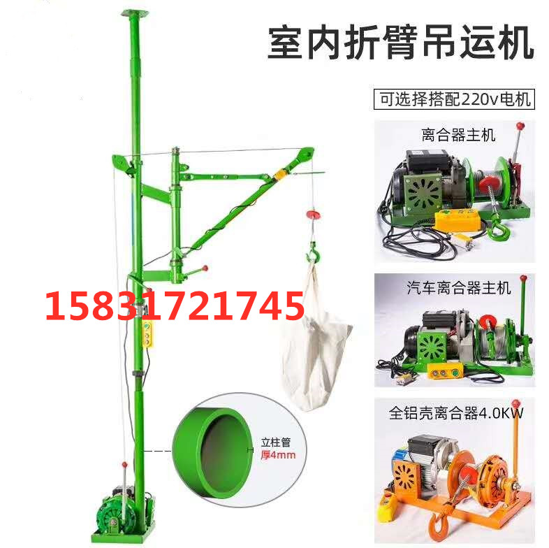 折臂吊运机型号有300公斤,400公斤,500公斤,起升高度范围为30米~100米,常用起升高度为30米,60米。需要搭配220v离合器主机使用,实现起重吊料和快速下放的功能。主机类型有普通离合器主机,快速离合器主机,汽车离合器主机,具体可根据您的需要来选购。联鑫厂家直销货源,规格型号齐全,厂家批发价格。现货供应,支持定制。厂家电话:15831721745 卢经理(weixin同号) 联鑫室内折臂吊运机是为适应现代住宅楼的小窗口设计的。它既保留原有的机型,轻便快速的优点