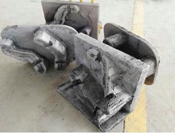 在生产实践中,大的平板类铝铸件表面比较容易产生夹砂,就是属于此种情况,因为平板类铸件高度很低水平面积较大,金属液上升速度慢,因而金属液对型腔上表面的热辐射作用既时间长而又强烈烘烤,抗夹砂能力低的型砂,经长时间十几秒的高温烘烤灼热就可使型腔表面拱起开裂。而下表面受金属液的应力作用不会变形而产生夹砂。因此,对大平板类铸件采用倾斜浇注防止夹砂。
