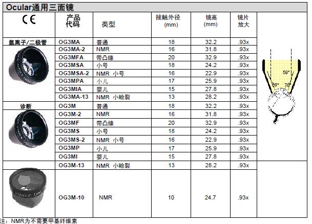 图像放大:.93X,光斑放大:1.08X,接触直径:18mm,透镜高度:32mm,静态房角视野:140度美国OCULAR同时生产其它型号的激光或诊断三面镜,分别是无需甲纤的激光或诊断三面镜,带开睑缘激光或诊断三面镜,小号激光或诊断三面镜,小儿激光或诊断三面镜,幼儿激光或诊断三面镜婴儿激光或诊断三面镜。