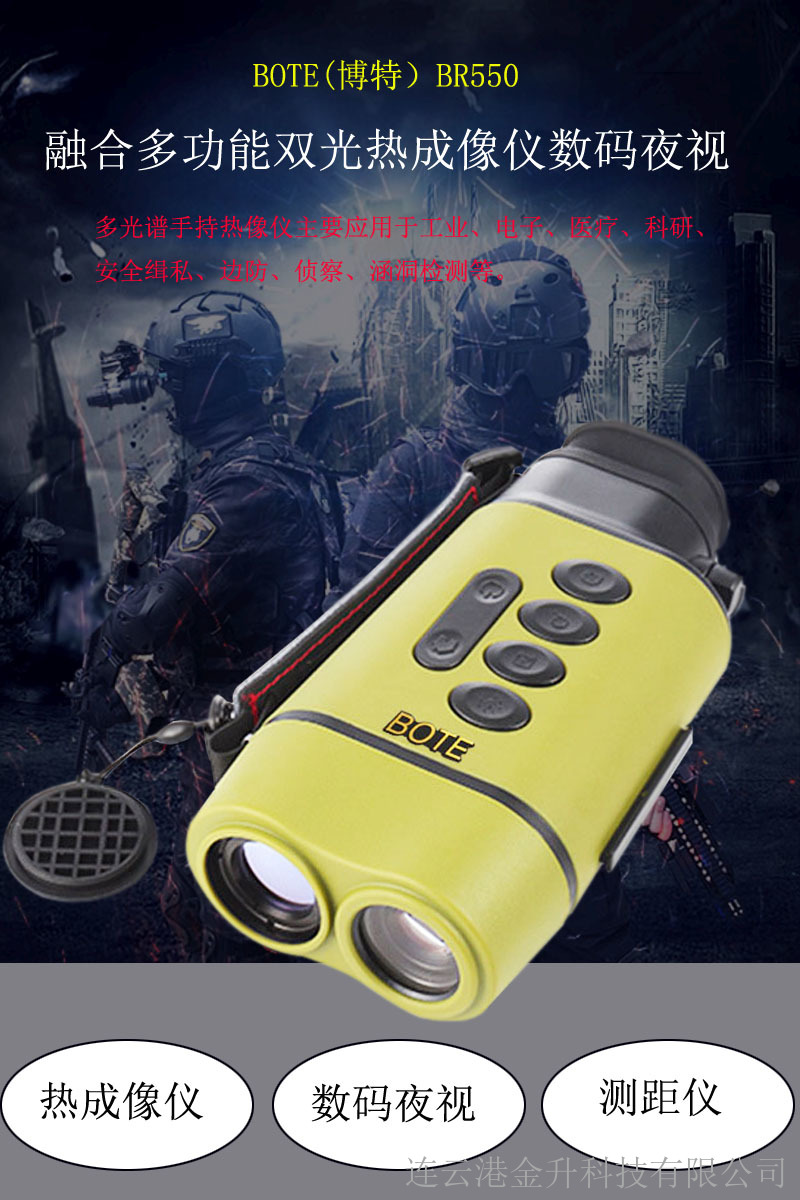 BOTE(博特)融合多功能双光热成像仪数码夜视BR550(具备红外热像仪+夜视仪+测距仪功能一体) BR550是一款双光融合热像仪。它采用红外、微光融合,结合了红外、微光各自的优势,使成像分辨率更高,单体更易被识别,且解决了单红外不能透过玻璃的缺陷,同时它又新增加融合聚焦(画中画)功能,能对单点进行放大且保持很高的清晰度。