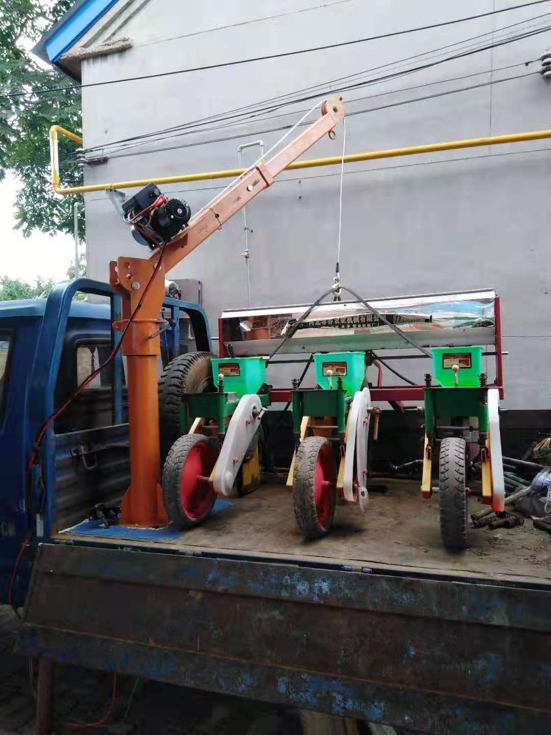 小吊机(车载小吊机)安装在货车上面,因为吊臂长度不够,货物离着车载吊机有3米的距离,为了能节省购买车载吊机的价格,用户也不愿意加长吊机尺寸,结果想出来一个简单的操作办法:货车离着车载吊机3米之远,车载吊机吊钩可以顺着60度角度挂住货物,然后启动电源,就这样货物硬生生的被吊钩与钢丝绳拖拽,拖拽到吊运机对应的位置,但是前提被托运的货物下面部分必须是带轮子的,如果没有轮子被吊物会硬生生的拽坏。