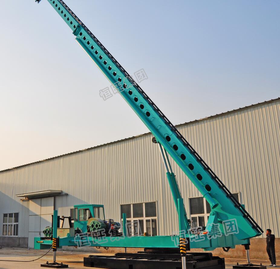 桩机组成:该机包括液压步履桩架和钻进系统两部分。桩架采用液压步履式底盘,自动化程度,可自行行走及回转,设有液压支腿以辅助行走及回转并增加施工时的整机稳定性。桩架设计有拖行装置,可整机进行转运。立柱为可折叠式箱型立柱,法兰连接方式,由液压缸控制其起降。