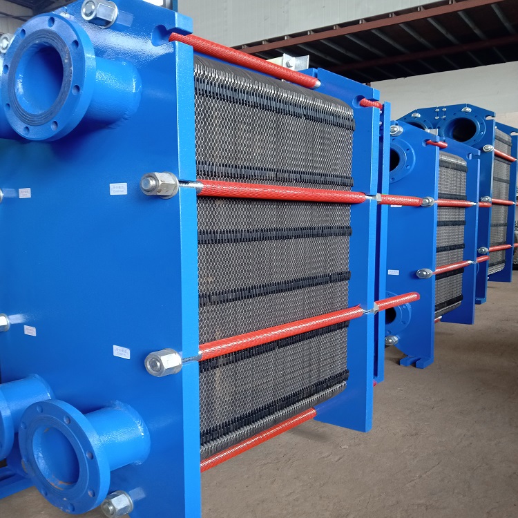 在供热系统中,采用的板式换热器,多为波纹板式换热器。由成组的换热片平行排列组成多个流道,加热水和被加热水分别从相邻的流道逆向流动,依靠相邻的换热板实现热交换。该型换热板片,系用不锈钢薄板压制成断面呈波纹状,波峰高3.5~4.0mm,峰间距约15mm。将板与板叠合构成3.5~4.0mm径向宽的流体通道,靠薄板波峰相互顶靠,借以支撑流道间的压差,控制住该流道宽度。流体通过波峰顶靠点之间的曲线通道,形成曲线湍流。换热板片上下方开设有流道连接孔,靠压紧的橡胶垫圈连接流道,或隔断不应接通另一侧流道。压紧的橡胶垫圈是由换热器两侧的厚夹板和拉杆以螺栓旋紧来固定的。加热水和被加热水两侧流道,均由多个单流道并联起来形成一组换热流程,将几组换热流程串联起来,达到需要的流道长度。用两侧的承压夹板经拉杆将重叠好的换热板片整个拉紧,达到确保密封,不使流道间窜压、泄流和向换热器体外泄压、浸水。