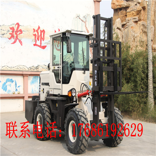 越野式叉车又叫野战叉车,是在机场、码头、车站等路况条件较差的物资集散地装卸物资的设备,它具有良好的机动性、越野性相可靠性。越野叉车的速度高于普通叉车,目前已发展到72Mm/h,其机动性显而易见;越野叉车发动机功率大,采用全轮驱动和越野轮胎,因而能够在臣陵、山地、滩头、沙地、雪地、冰上及泥泞道路上行驶,越野叉车具有良好的越野性能;越野叉车车架有边梁式相中部铰接式几种,门架有否直门架式、液压伸缩臂式和连杆前移式等多种,无论哪一种,都能确保作业中的可靠性。越野叉车车身宽大,能承载不规则和宽大的货物。离地间隙高,可以跨越场地上的障碍物。有四驱功能,可以在泥泞的场地工作。越野叉车适用于建筑工地矿山、果园牧场,路面粗糙的工矿企业等我们一般使用的叉车严格的来说是工业用叉车。