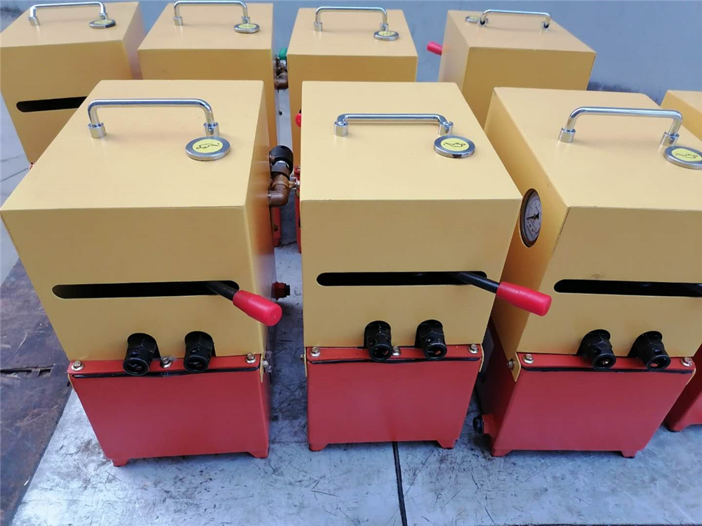 宇成液压油泵有手动型,气动型和电动型的,手动型需要人力控制,费时费力,电动型需要用到电,在煤矿井下使用存在安全隐患,而气动油泵是以压缩空气为动力,安全可靠,可在煤矿井下使用,相比手动油泵使用更方便高效,所以气动油泵的应用最为广泛,常与张拉千斤顶,退锚器,拉力计,切断器等配套使用。QYB50/0.8铁壳气动油泵介绍一下。