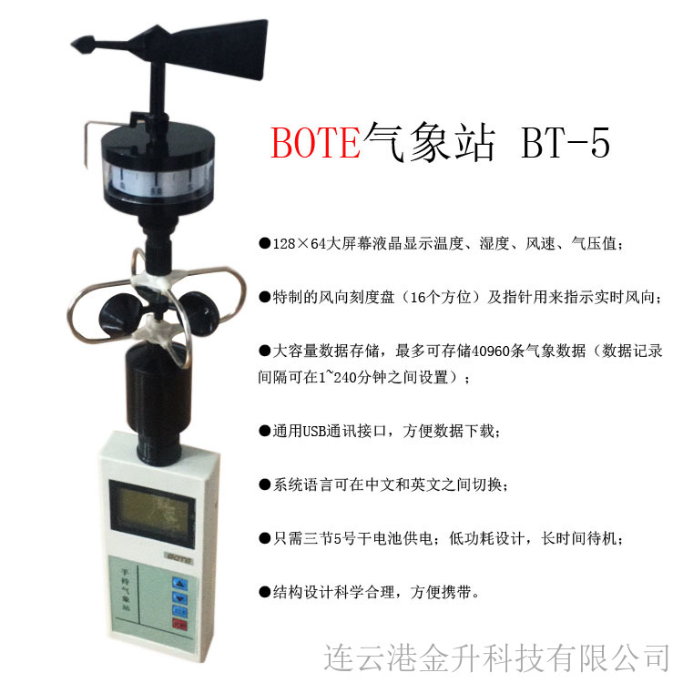 BOTE五合一手持式气象站BT-5是一款携带方便,操作简单,集多项气象要素于一体的可移动式气象观测仪器。系统采用精密传感器及智能芯片,能同时对风向、风速、大气压、温度、湿度五项气象要素进行准确测量。内置大容量FLASH存储芯片可存储大概一年的气象数据;通用USB通讯接口,使用配套的USB线缆即可将数据下载到电脑,方便用户对气象数据的进一步处理分析。