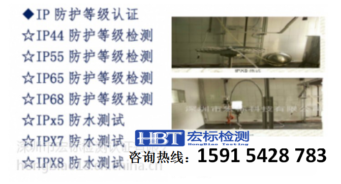 【宏标检测】第三方权威机构,可以为您出具带有CNAS、ilac-MRA中国认可国际互认标识的权威公正的中、英文质量检验报告.在产品的研发、品质的鉴定、市场的拓展等方面发挥重要的作用。具体检验项目、费用来电联系。IP防护等级测试● IP68、IP67、IP66、IP65、IP64/IP55、IP54、IP45/IP44、IP23、IP32等淋雨/喷水/持续潜水浸泡/沙尘试验。