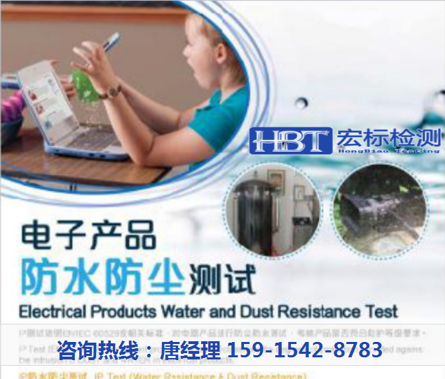 【宏标检测】第三方权威机构,可以为您出具带有CNAS、ilac-MRA中国认可国际互认标识的权威公正的中、英文质量检验报告.在产品的研发、品质的鉴定、市场的拓展等方面发挥重要的作用。具体检验项目、费用来电联系。IP防护等级测试● IP68、IP67、IP66、IP65、IP64/IP55、IP54、IP45/IP44、IP23、IP32等淋雨/喷水/持续潜水浸泡/沙尘试验。