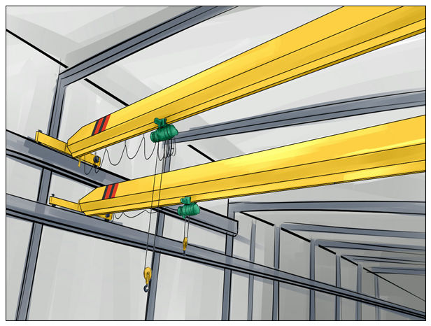 桥式行吊主要由桥架、大车运行机构、小车、电器设备等组成。根据使用频繁程度不同,分为A5、A6、A7三种工作级别。桥式行吊动作操作全部在司机内完成。整机结构新颖、造型美观、工艺性好、操作灵活平稳、安全可靠。