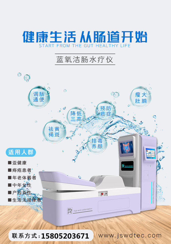 江苏纬度电子科技有限公司的网站:http://www.jswdtec.com/研发的水疗仪以清洗为先,调理为主的肠道水疗项目,是通过肠道的清洗,来调理身体的亚健康状态,通过水的物理功能来达到人体调理调养的目的,并对人体的健康调理起到显著效果,利用恒温原理将清水注入肠道,从而让肠道內的毒素得到清理,达到养生保健,瘦身和健康调理的一种纯物理自然疗法,是现代家庭中较流行的一种养生保健方式。