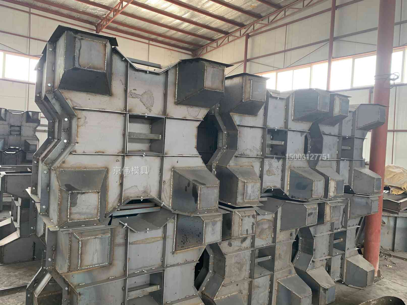 保定京伟模具四脚空心方块的模具,包括第一侧板、第二侧板、第三侧板、第四侧板、顶板和底板,第一侧板与第三侧板相互对称且安装在底板上,第二侧板与第四侧板相互对称且安装在底板上,第二侧板与第四侧板分别与第一侧板、第三侧板的两侧边安装,第一侧板、第二侧板、第三侧板与第四侧板的顶部分别与顶板固定,第一侧板、第二侧板、第三侧板、第四侧板、顶板和底板之间形成封闭的空腔结构;第一侧板、第三侧板上的各拐角处设有倒角。本实用新型要解决的技术问题是提供一种结构简单、拆模时保护棱角,避免底部漏浆的用于成型四脚空心方块的模具。