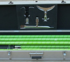 除冰器具操作头按照作用设计成不同形状,使用时可以通过敲、铲、钩等方式有效除去瓷瓶、支架、导线及杆塔上的积雪及覆冰。使用时,根据需要从套件中选取合适的除冰器具,将其安装到绝缘杆的一端并拧紧后即可使用。绝缘杆分为长、短两种规格,可以根据现场情况进行任意组合,以获取合适的长度来满足不同场合的需求。