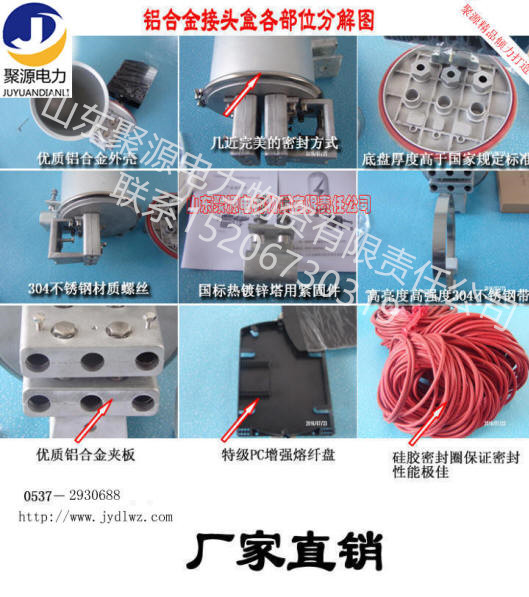 由“山东聚源电力物质有限责任公司”生产的新型改进型卡箍固定铝合金接头盒,解决了原来产品紧固过程中出现的漏气,密封不严的弊端,几近完美的密封方法,更具有防腐、防水、防尘、抗冲击、寿命长、价格优。安装使用方便等优点,是接续盒更新换代和施工单位光缆线路安装施工的首选,欢迎新老客户选购!