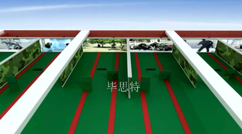 室内靶场,场地长为50m,宽10m,梁底净高4m,建筑顶面、内墙面及地面均为混凝土面或抹灰面。现根据场地情况及使用方要求,在场地内配置4套激光定位实弓单精度报靶设备和复合2屏实弓单、模拟影像训练系统。