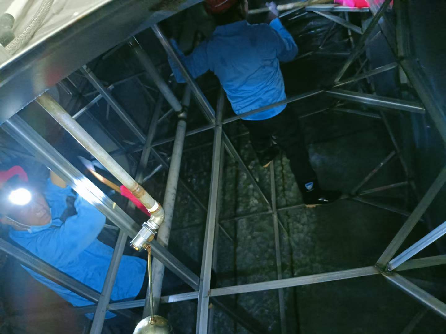 鼓风机往水池内吹风,保证水池内氧气充足,水池口配备一名工人,随时确认池内人员安全!