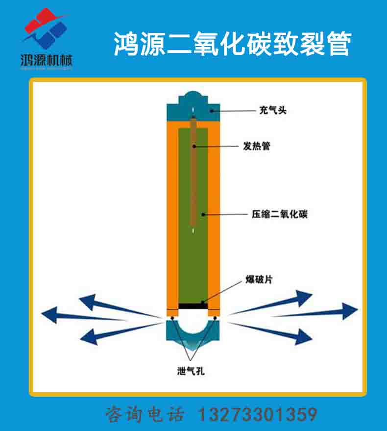 二氧化碳致裂属于矿用物理致裂设备,是利用液态二氧化碳受热气化膨胀,当微电流通过高导热棒时,产生高温击穿安全膜,瞬间将液态二氧化碳气化,急剧膨胀产生高压冲击波致泄压阀自动打开,快速释放高压气体破断岩石或落煤,解决了以往用扎药致裂开采和预裂中破坏性大,危险性高及矿体粉碎等缺点,为矿山安全开采和预裂提供可靠*证,广泛适用于煤矿和非煤矿山作业区的使用,这种利用液态二氧化碳吸热气化时体积急剧膨胀产生高压致使岩体开裂,是一种比较的安全的致裂方式。